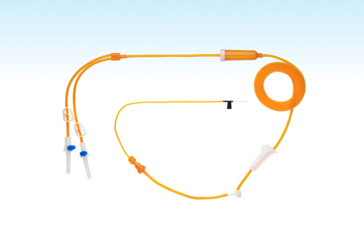 2、产品的管路采用三层共挤工艺,独特的三层管路符合避光结构设计,中间层为避光层,能有效隔绝避光剂与药液接触,保证输液安全;